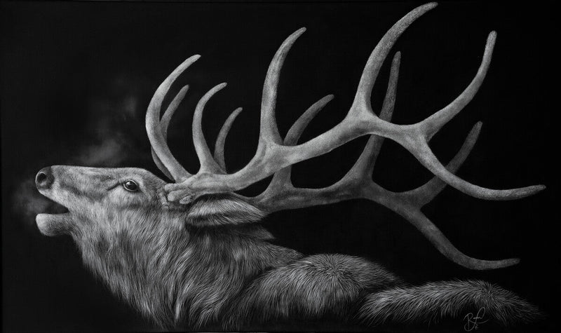 As the artist behind "Ascendance," I aimed to capture the essence of the majestic elk in black and white. Through my skillful use of Realism/Realistic technique and monochromatic palette, I created a timeless and sophisticated piece that invites viewers to appreciate the intricate details of the animal's features. My painting is a celebration of wildlife and serves as a reminder of the importance of preserving and protecting these magnificent creatures. I believe any art lover or wildlife enthusiast would be honored to add this large elk painting to their collection.