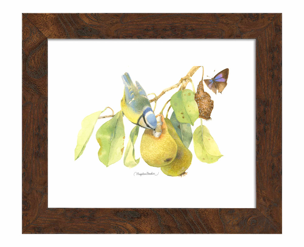 My small orchard suffers during these hot, dry summer weeks. As I walk through I catch this Eurasian blue tit picking a hole in a beautiful pear – what a vandal! But wait, the bird isn’t the only creature enjoying these pears. Flies and many wasps take advantage of the holes in the fruit, and make them bigger. Fine with me, a wasp on the fruit means one less wasp interested in what I have on my plate.