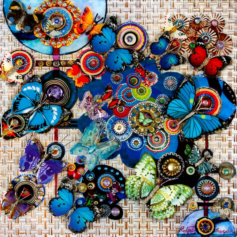 When it comes to creating collage art, I take a surreal approach and leave it up to the viewer to interpret what they see. My intention is to captivate the audience and encourage them to uncover something new every time they look at my work. One of my pieces, Butterfly Blues, is a celebration of my admiration for these magnificent creatures and the vibrancy they bring to our world during their brief existence. The original collage art features bright blue paper butterflies adorned with jewel-encrusted circles set against a basketweave placemat.