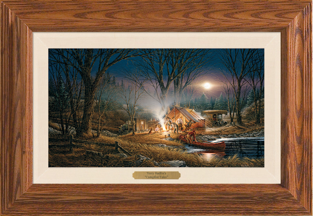 As a boy, Terry Redlin listened in awe as his father carefully planned hunting and fishing trips. He never forgot the excitement and wonder of those special times. The homemade camper top on the old pickup is a forerunner of the modern versions. The four deer are secretly watching the activities. Only in the morning will tracks reveal their presence. The man launching the wooden canoe occasionally dipped, as we detect from the Copenhagen can vaguely outlined in his rear pocket. And the group's tall storyteller relaxes in a folding chair, hands extended, to recall the big one that got away. As the misty smoke rises to greet the moon we, too, can share in Terry Redlin's unique vision of man's romantic encounter with the wild.
