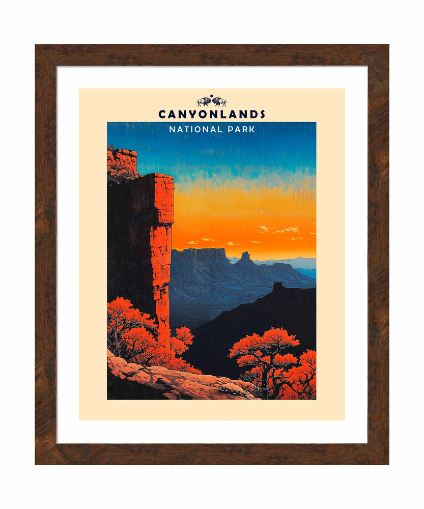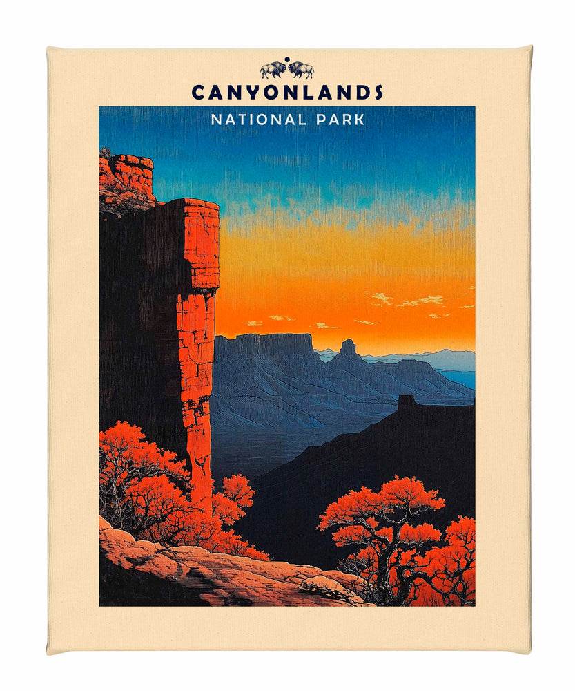 This vintage-style poster art of Canyonlands National Park captures the park's dramatic landscape in a striking composition. The foreground features a towering red rock formation, likely one of the park's iconic mesas or buttes, set against a vibrant sunset sky that transitions from deep blue to orange. The stark contrast between the illuminated rock face and the shadowed canyons creates a sense of depth and grandeur. In the mid-ground, vibrant orange trees add a pop of color and life to the rugged terrain. The background reveals silhouettes of distant mesas and canyons, emphasizing the vast expanse of the park. The limited color palette and simplified shapes are characteristic of mid-20th century travel poster aesthetics, effectively conveying the park's majestic beauty and enticing viewers to experience its awe-inspiring vistas firsthand.