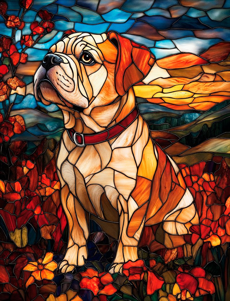 "English Bulldog" captures the steadfast and endearing nature of this iconic breed through the intricate brilliance of stained glass artistry. The bulldog, with its distinctive features and soulful expression, sits proudly amidst a vibrant field of red and orange flowers, evoking warmth and resilience. The composition is illuminated by the golden hues of a setting sun against a serene backdrop of rolling hills and a vivid blue sky. Every detail, from the bulldog’s fur to the glowing floral elements, is meticulously crafted to celebrate the breed’s loyal and courageous spirit while blending it seamlessly with the beauty of nature.