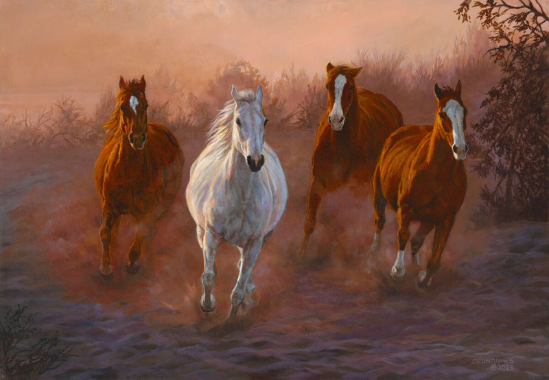Caught in the last rays of the setting sun as they race downhill, the horses turn a corner, kicking up golden dust.