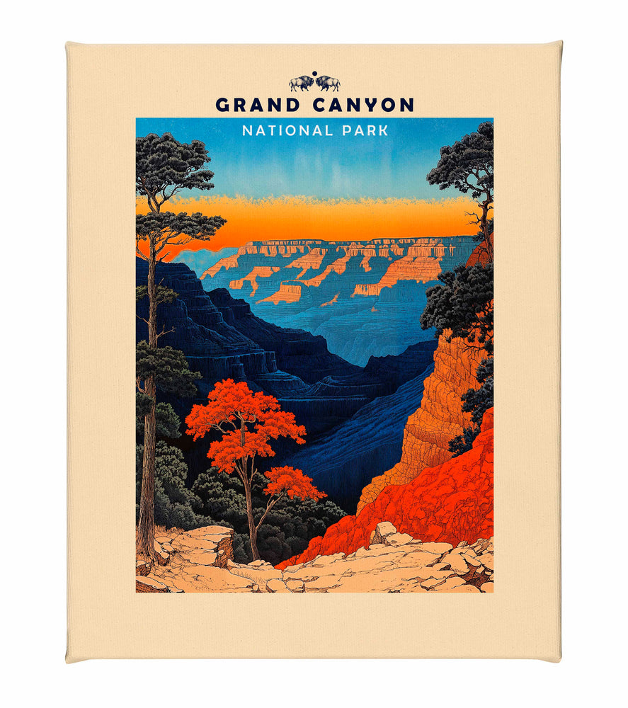 This vintage-style poster art of Grand Canyon National Park masterfully captures the awe-inspiring vastness and dramatic beauty of one of America's most iconic landscapes. The composition draws the viewer's eye into the deep, layered canyon, framed by rugged cliff faces and pine trees. The foreground features vibrant orange-red rock formations and a pop of color from autumn foliage, creating a striking contrast with the cool blue shadows of the canyon's depths. The distant mesas and buttes are bathed in warm sunlight, their horizontal striations hinting at millions of years of geological history. The sky transitions from a deep blue to a warm orange glow at the horizon, suggesting a breathtaking sunset or sunrise. This artwork's use of bold, contrasting colors and detailed rendering effectively conveys the Grand Canyon's immense scale, intricate rock formations, and ever-changing play of light and shadow. The poster beautifully encapsulates the park's majestic scenery, inviting viewers to experience the grandeur of this natural wonder for themselves.