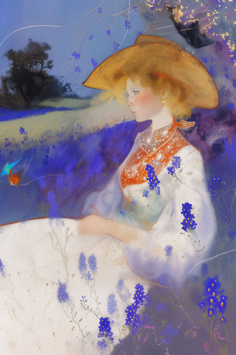 "Homestead Heartache" captures a serene yet melancholic moment, blending the vibrancy of nature with the quiet introspection of its subject. The composition centers on a young woman, dressed in a soft, flowing white dress adorned with intricate red patterns, as she sits amidst a field of deep blue wildflowers. Her posture, slightly turned to the side, suggests a pensive or wistful mood, evoking a sense of longing or reflection.