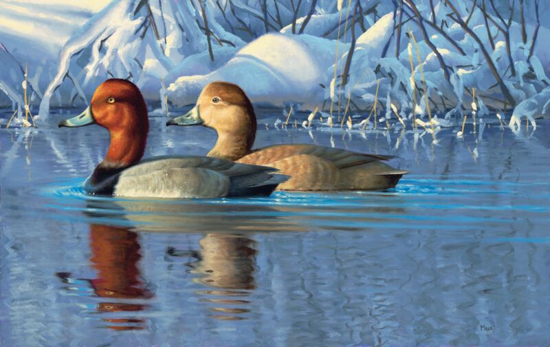 Two redhead ducks swimming in the lake on a sunny winter day.