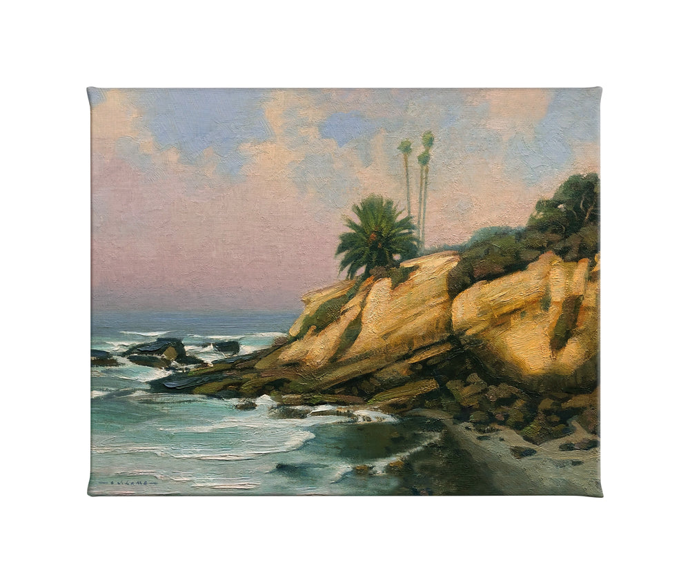 There are several well-known strips of rocks that jut out into the surf at Laguna Beach, CA which are often painted by artists visiting the area. This view is one of them. I have painted it numerous times over the years, sometimes from the cliffs above. The soft, warm early morning light gave this one a pleasing visual feel.
