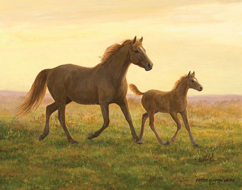 A mare and her foal trotting in the light of early morning.