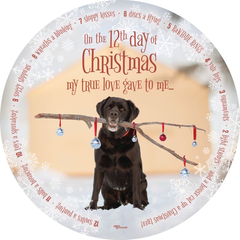 Lab with stick adorned with Christmas ornaments in its mouth. Dog themed twelve days of Christmas inscribed around the perimeter.