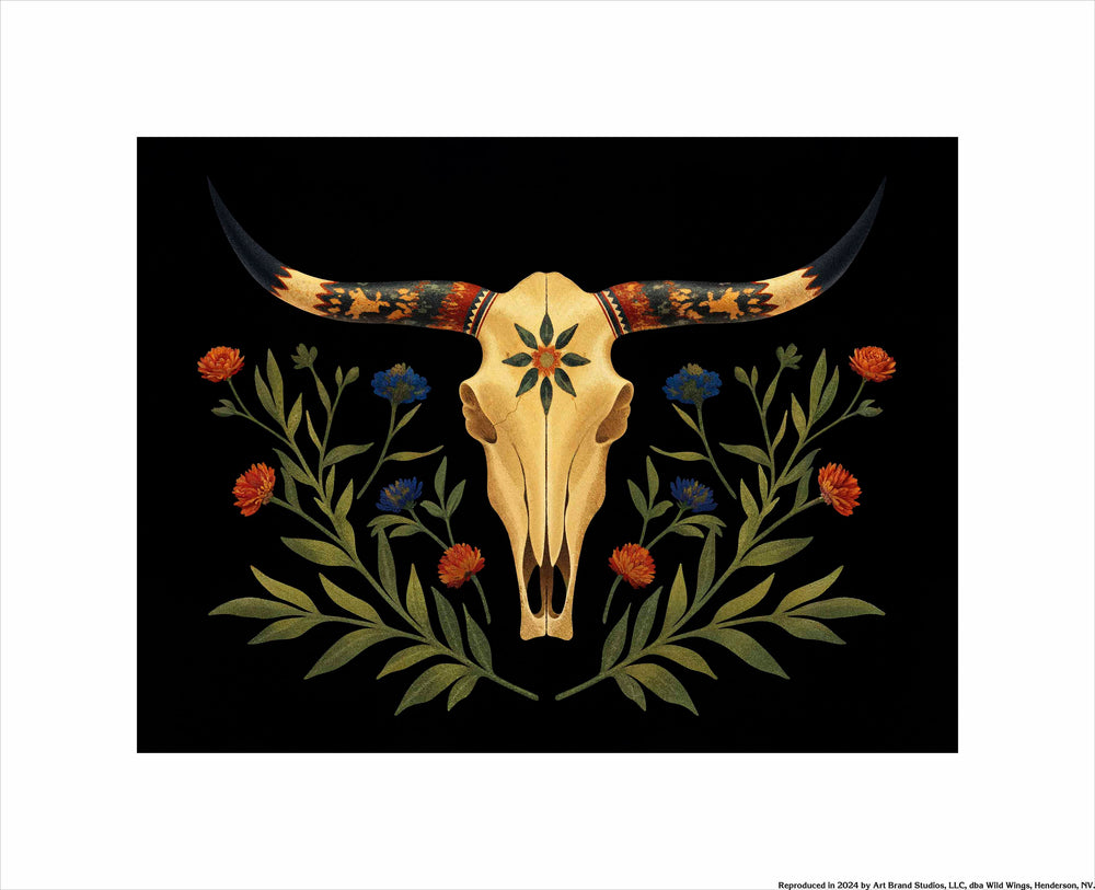 "Prairie Guardian" is an evocative piece that draws inspiration from the spirit and vastness of the American plains. Central to the composition is the skull of a longhorn, a symbol of resilience, strength, and connection to the land. The skull is adorned with an intricate pattern, suggesting a blend of cultural symbolism and a reverence for the natural world.