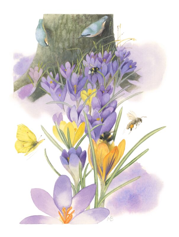 Our garden in the woods looks as if somebody from high above sprinkled crocus flowers everywhere. A purple blanket is draped over the lawn. Our dog Yogi is quite curious by nature and every time I bend down to take a closer look at one of the flowers he has to be right by my side. Unfortunately he has large paws…poor delicate crocuses.