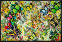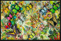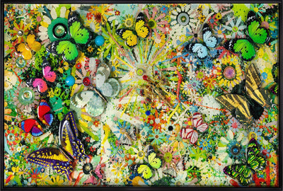 I take a surreal approach when creating collage art. I aim to captivate the viewer and allow them to interpret the piece in their own way without dictating what they should see. Butterfly Oasis is one of only a few horizontal collages (24” x 12”) I have produced over the years. Created in 2019, this mixed-media on-board piece consists of three-dimensional butterflies encrusted in jewels and gems against a floral background. Papillons take flight against shades of green, yellow, red, and blue in this stunning collage. You can almost hear them fluttering away.