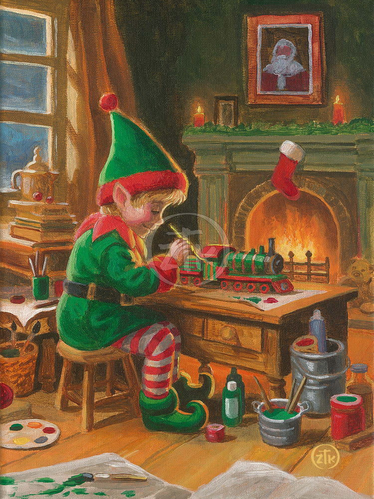 A young elf (or maybe ancient) works tirelessly at his table creating a toy train designed to delight its soon-to-be recipient. The portrait Santa bears witness to the task as the job is completed. In recognizing the effort, I say, "Cheers to the Elves" and all they do to make our holidays special. And I also say, "Cheers to You" for joining me in my adventure in art.