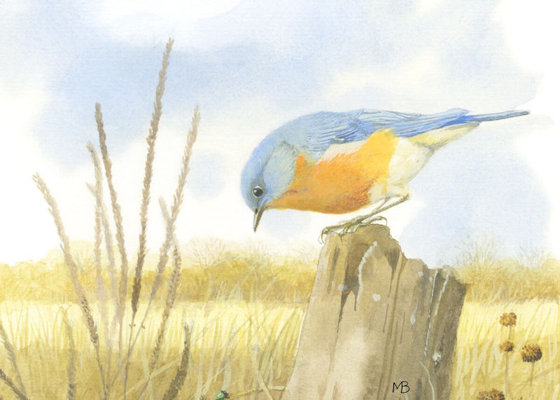 Typically I need only two colors when painting the prairie this time of the year: a golden-yellow and ochre. Done. Maybe a little brown for the spent prairie flowers. All the bright colors have been removed. But then – WOW! – a blue flash streaks by and everything springs back to life! The fields seem more yellow, the sky a brighter blue. Colors definitely influence the perception of other colors.