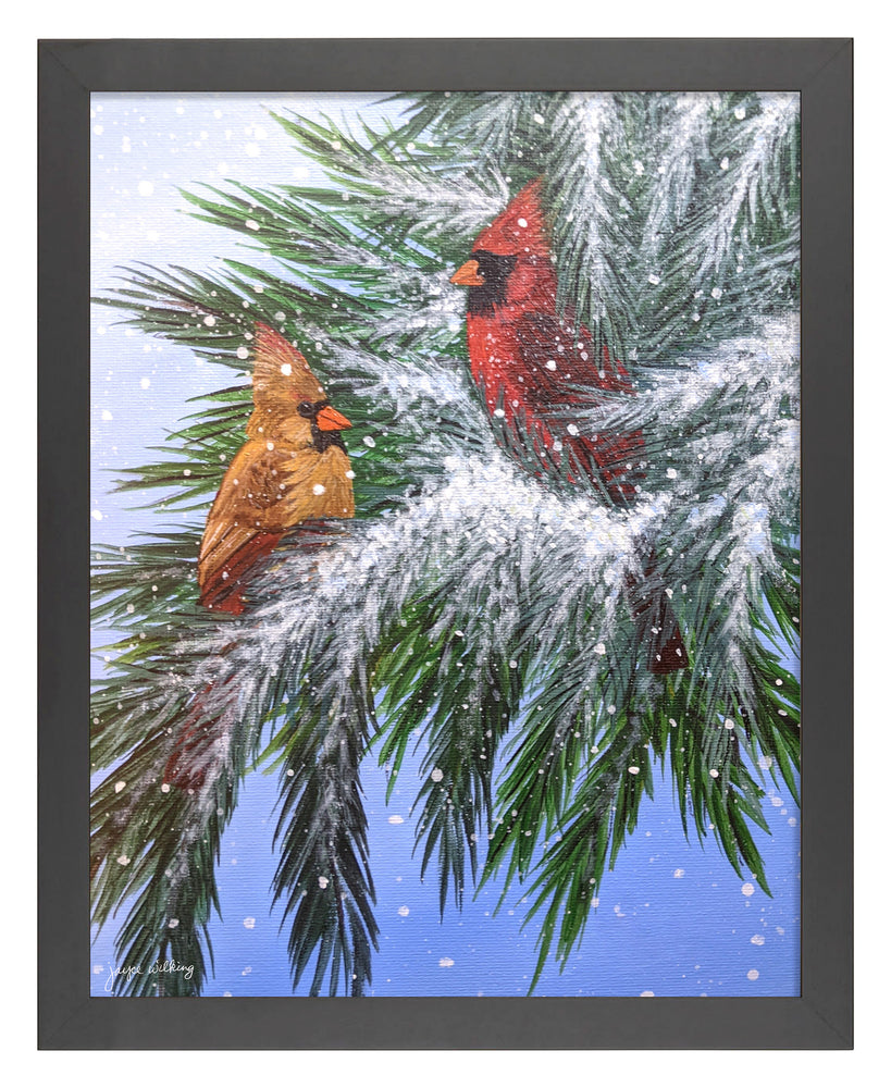 The male and female Cardinals are hiding in the snowy pine tree until it's safe to go to the bird feeder. Her will go first, then when she feels safe, she will go eat.