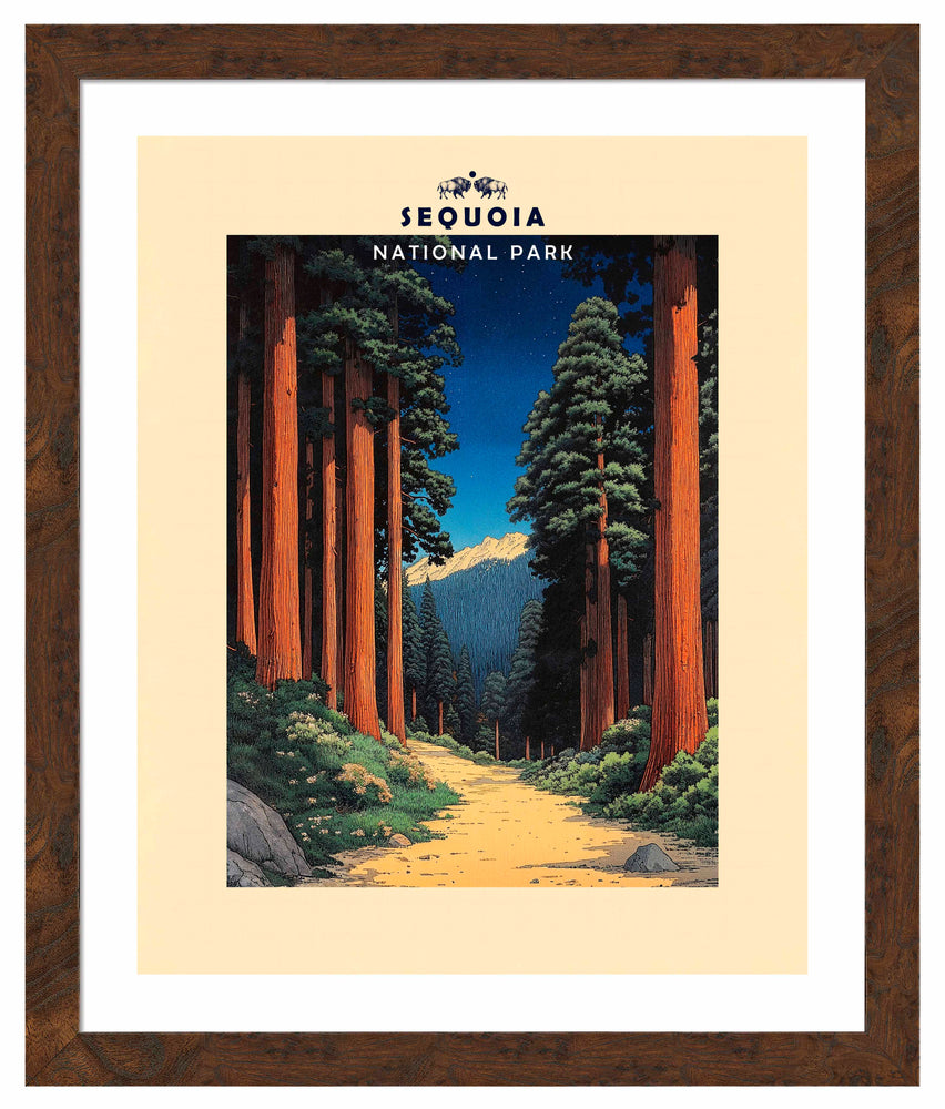 This vintage-style poster art of Sequoia National Park masterfully captures the awe-inspiring grandeur of the giant sequoia forest. The composition is dominated by towering sequoia trees, their massive reddish-orange trunks framing a golden path that leads the eye towards distant, sunlit mountains. The contrast between the warm, glowing trees and the cool blue of the starry night sky creates a magical, almost ethereal atmosphere. The foreground is rich with detail, showing forest undergrowth, rocks, and smaller trees that emphasize the immense scale of the sequoias. The winding path invites the viewer to imagine walking among these ancient giants. The artwork's use of dramatic lighting and color contrasts effectively conveys the majesty and timelessness of the sequoia grove. This poster beautifully encapsulates the unique experience of standing amidst the world's largest trees, enticing viewers to explore the natural wonders of Sequoia National Park for themselves.