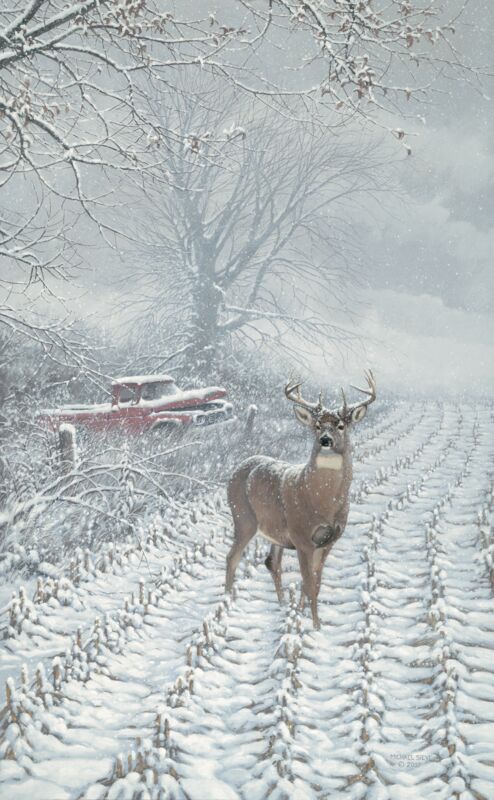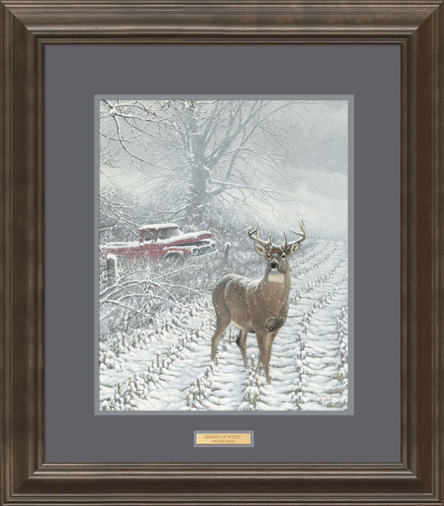 The three 'Shades of Gray' paintings show a whitetail buck in the place he calls home at three different times during the fall, and at different times of the day. In 'White,' it is late fall or early winter. The stress and rigor of the rut have left this buck tired and hungry. If he is to survive, he will have no choice but to move into the fields to feed in order to restore his lost body weight.