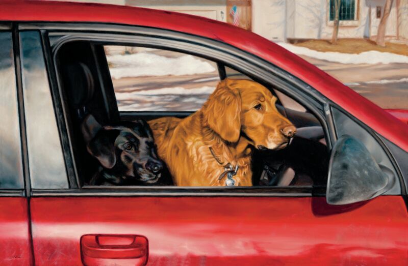 Two dogs, one Black Lab and one Golden Retriever, both sitting in the front seat of a red car with their heads poking out the window waiting for their master to return.