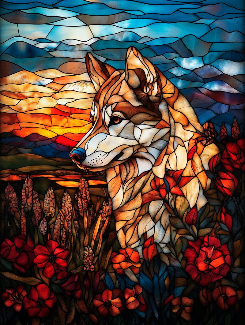 "Siberian Husky" captures the adventurous and spirited essence of this iconic breed through a radiant stained glass-inspired composition. The husky's piercing gaze and strong features are brought to life against a backdrop of fiery sunsets and serene, snow-capped mountains, symbolizing its resilience and connection to the wild. The vibrant reds, oranges, and blues of the surrounding flowers and landscape harmonize beautifully with the intricate patterns of the husky’s fur, creating a sense of movement and vitality. This piece celebrates the husky's noble spirit and enduring beauty, blending the majesty of nature with the breed's striking presence.