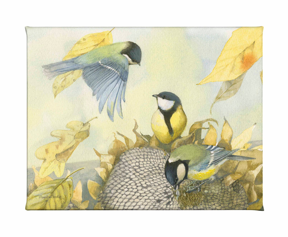 Sure, I could use the sunflowers from my herb garden for a beautiful bouquet. But this is a lot more fun! I’m leaving the flowers on the plant to fully mature and seeds to form. Then I cut them off and place them on a table right in front of my studio. Of course the Great tits are some of the first to take advantage but I have seen a variety of small birds, including woodpeckers, robins, blackbirds and finches.