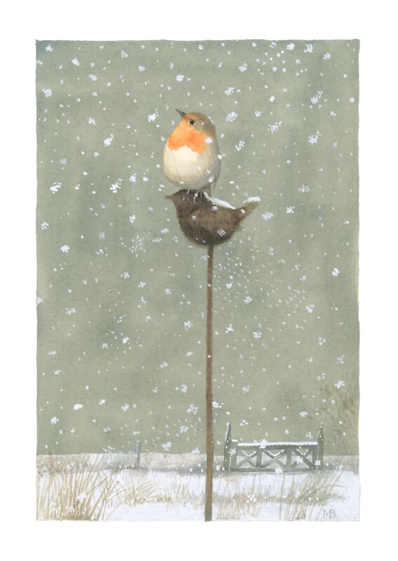 A European robin alights on top of the iron decorative bird that is stuck in the ground in front of my studio. As early as the nineteenth century, when people first started sending Christmas cards to each other, the European robin was frequently featured. A splash of color in a white world, a symbol of hope, warmth.