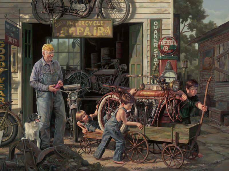 Every day after school, the boys would race down to Bill’s Motorcycle Repair Shop. If you were seven years old, the shop was magical. It was better than an amusement park, a zoo and a movie house all put together. The boys would follow Bill around and ask him a million questions, “What does this do Bill, where does this go, how much would this part cost?” Their one collective dream was to someday own their own motorcycle. One afternoon in late September their dream came true. The old Indian bike had sat around the garage for years; Bill had even forgotten where he had picked it up. For Bill, it was fall housecleaning; for the boys it was “the gift.”