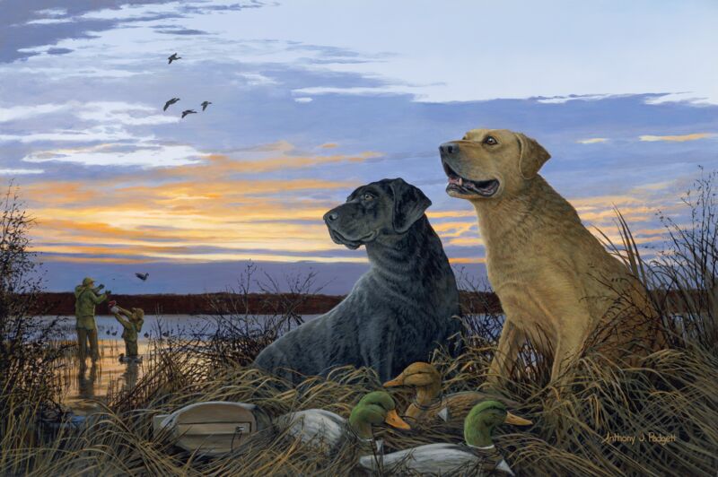 Spending time with children and grandchildren who share a passion of nature and hunting formed the backdrop of this painting. The hard work of casting decoys for the day's hunt has never been simple.