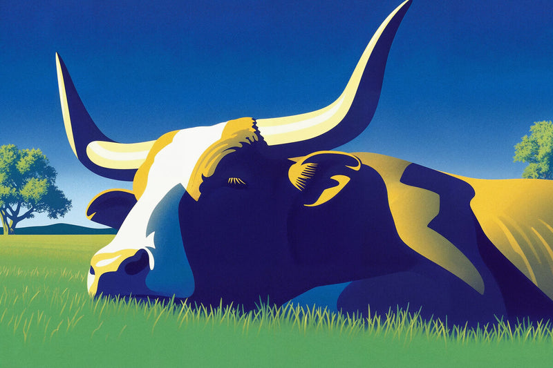 "The Sleeping Giant" is a serene and captivating portrayal of calm strength, embodied by a resting longhorn. The composition centers on the tranquil figure of a massive bull lying peacefully in a sunlit pasture. Its grand horns, striking in their size and curvature, dominate the image, giving the bull a sense of quiet majesty even in its repose. The smooth, geometric lines of the longhorn’s form are rendered in bold, contrasting shades of deep blue, golden yellow, and crisp white, capturing the animal’s powerful frame with a modern, minimalist aesthetic.