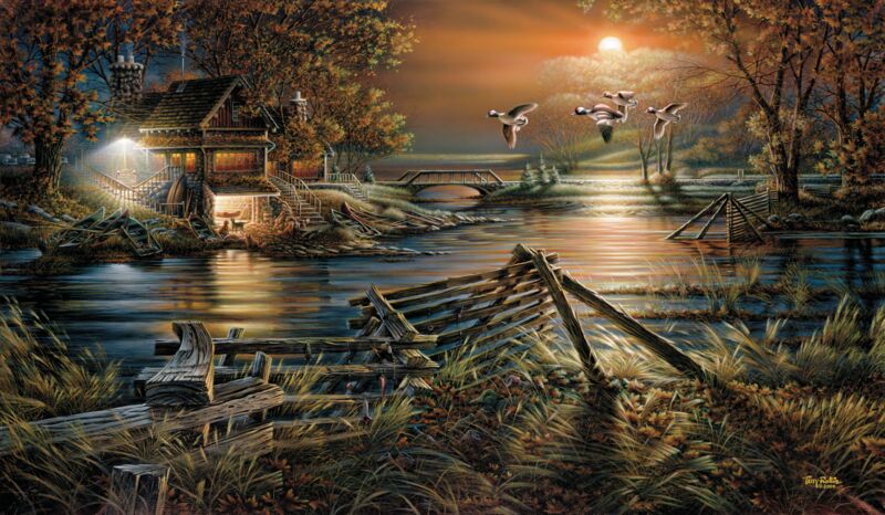 Across the river at the Lakeside Conservation Club the party is in full swing. Some drove to this idyllic setting, others arrived by boat after a little hunting and fishing along the way. Their dogs wait patiently by the water, as a flight of buffleheads swoop low in the setting sun’s golden rays. All is serene in this romantic painting, but the artist asks us to consider the impressive rail fence in the foreground. Sturdy enough to hold cattle in the pasture, it is carefully positioned on the river’s bank, so that enough of the stream’s flow creeps under the fence to offer the herd a good hearty drink.