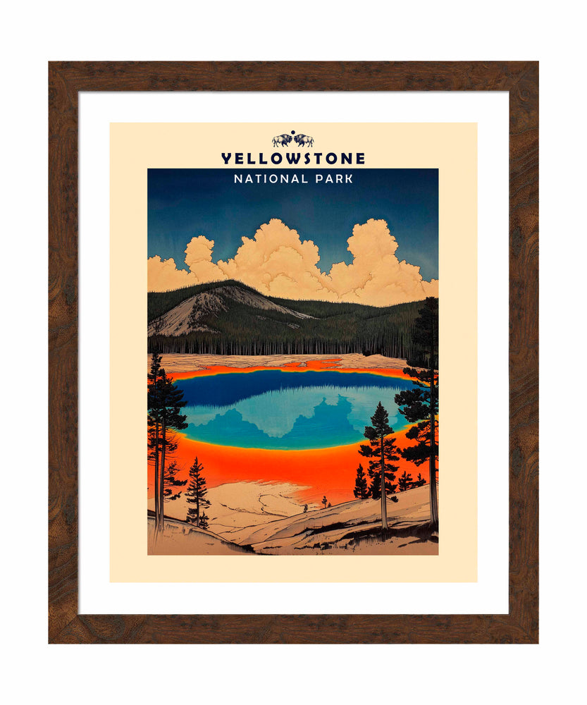 This vintage-style travel poster art depicts an iconic scene from Yellowstone National Park. The image showcases the vibrant, multicolored Grand Prismatic Spring, one of the park's most famous geothermal features. The spring's vivid blue center is surrounded by bands of orange, red, and yellow, accurately representing its real-life appearance. The composition is framed by silhouettes of pine trees, emphasizing the natural setting. Above the spring, billowing clouds dominate a deep blue sky, creating a dramatic backdrop. The mountainous terrain in the background adds depth to the scene. The artwork employs a limited color palette and simplified shapes, characteristic of mid-20th century travel poster aesthetics.