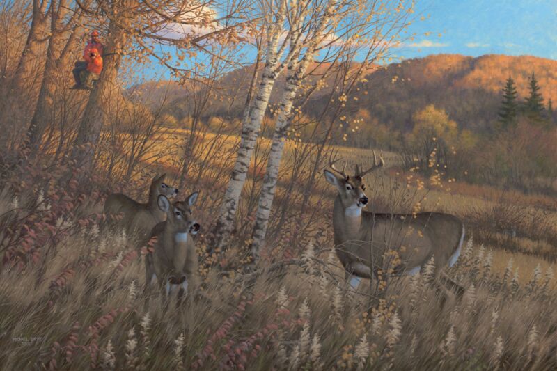 This painting, the third of four commissioned by the Minnesota Deer Hunters Association, shows the youth season of southeastern MN. the scene is my own farm and the deer stand is called Heather's stand. where my daughter Heather took her first deer when she was only thirteen years old.