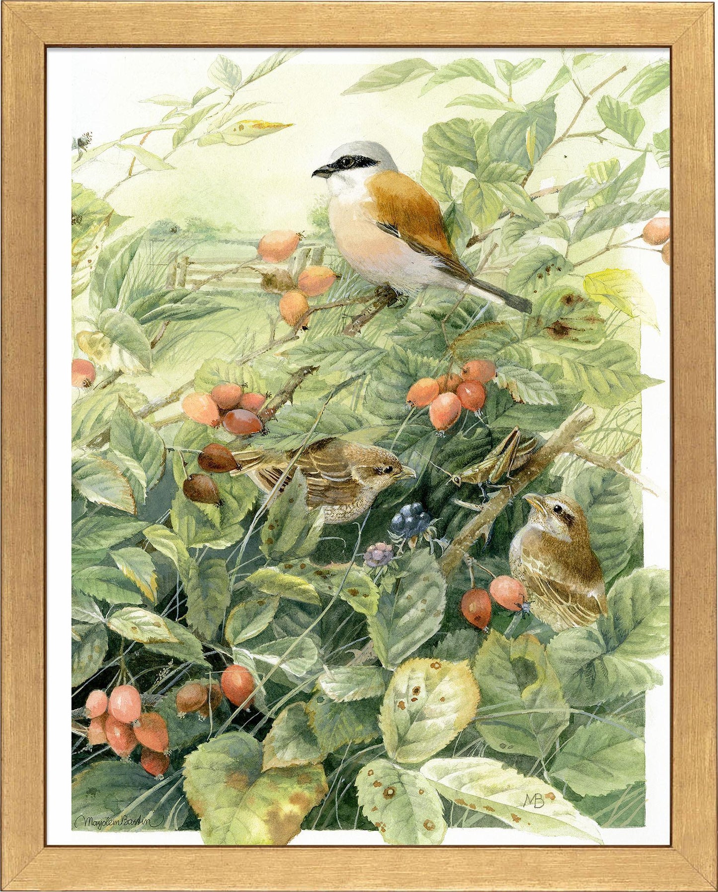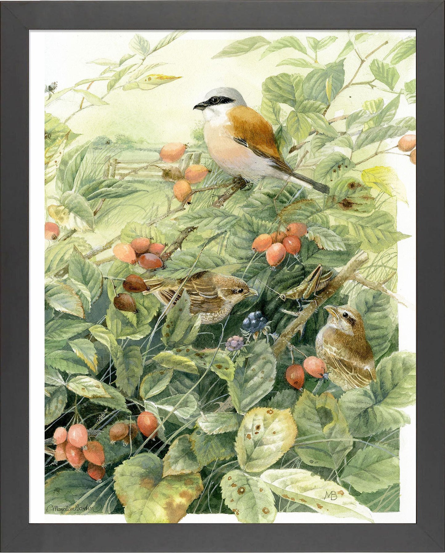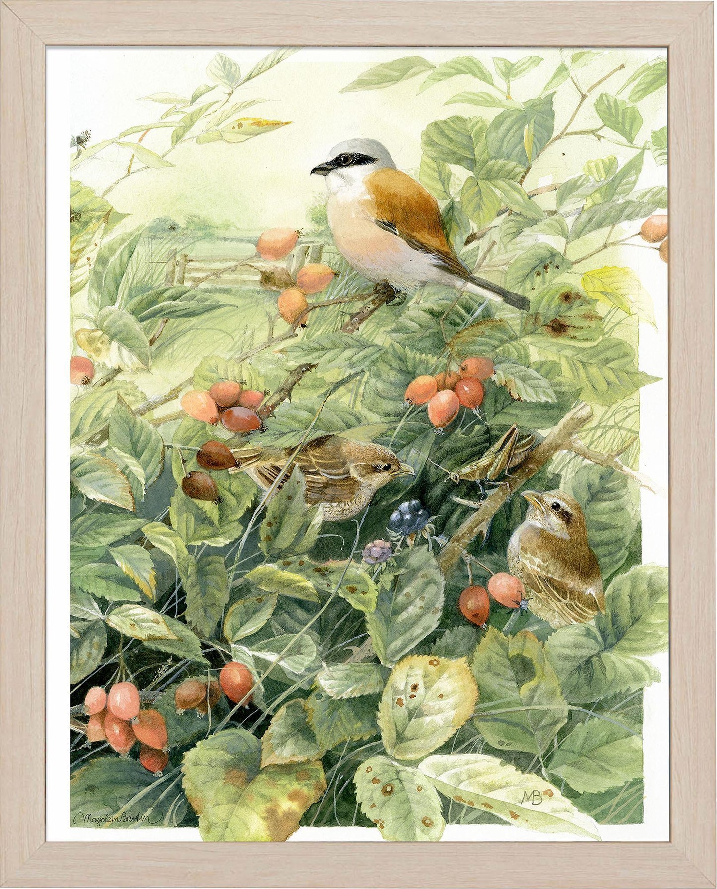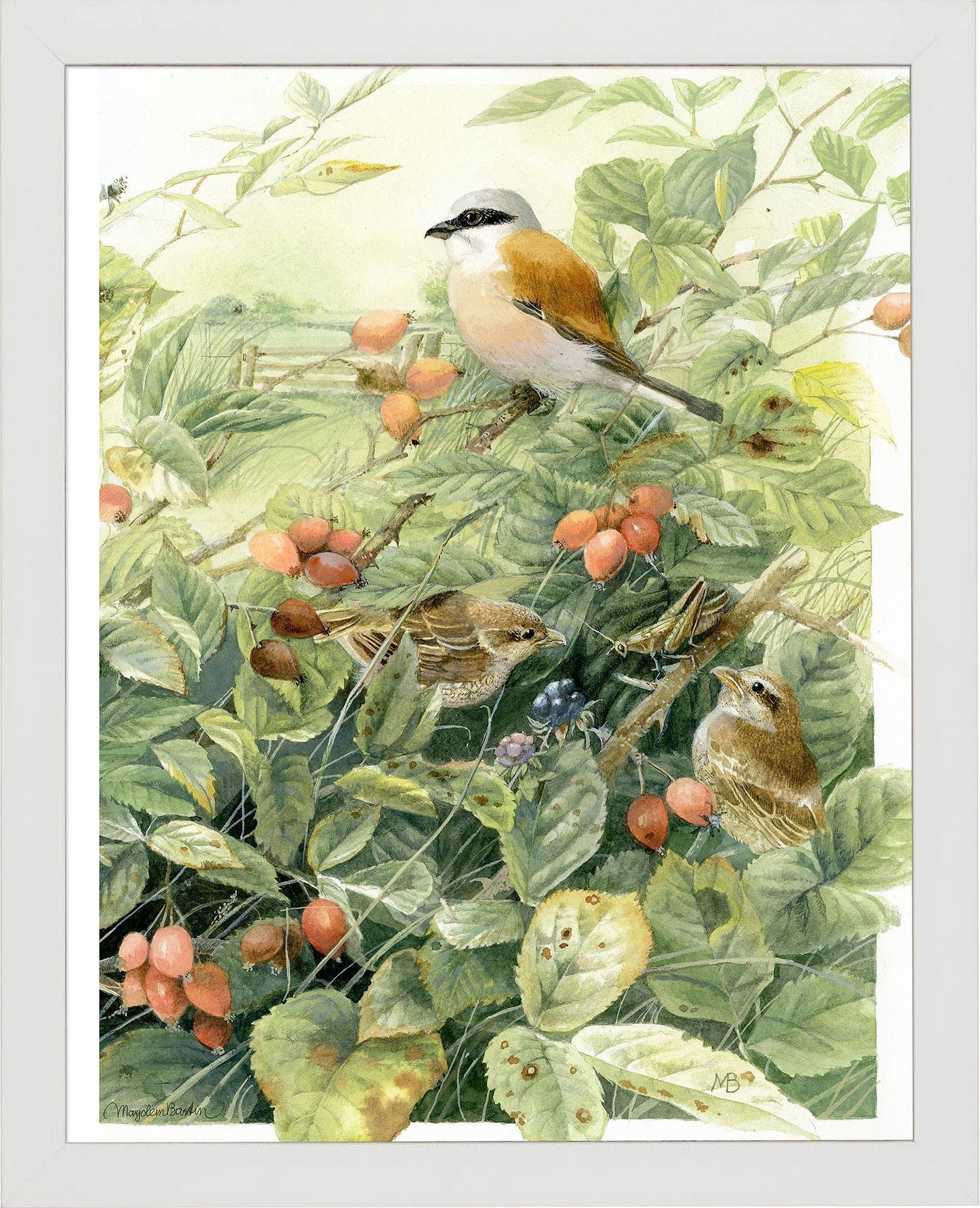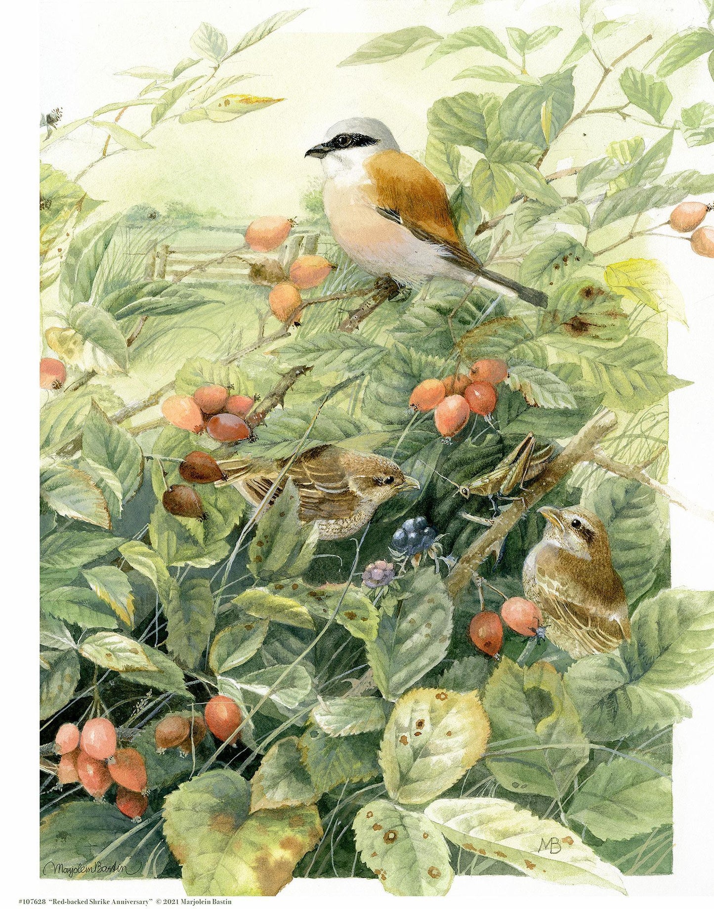 Open edition of art prints featuring a group of red-backed shrikes. Choose framed or unframed. Published exclusively by Wild Wings. Print size is 11"W x 14"H. Framed size is 13"W x 16"H.
