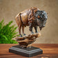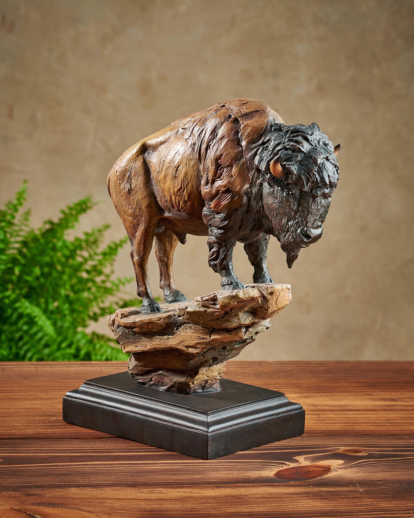 Bison were the lords of the prairie. The rumbling of thunder could be heard in the distance, the ground would begin to tremble, and suddenly a thundering herd of bison that stretched across the landscape would come into view. Cold cast and hand painted in fine detail. 10-1/2"H x 9-1/4"W x 6-1/4"D.