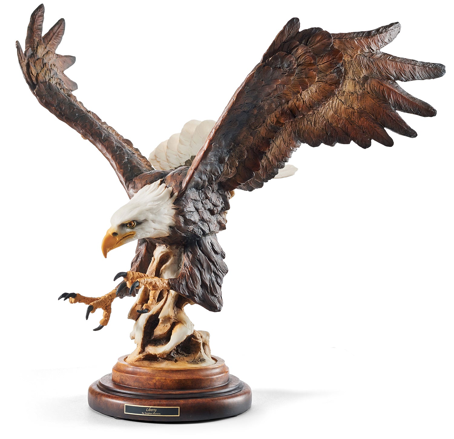 Create a big impression in an open space with this dramatic scene of a bald eagle, the ultimate subsistence hunter. Open edition sculpture, cold cast and hand-painted using the finest acrylics. 17"L x 14-3/4"H x 12"D.
