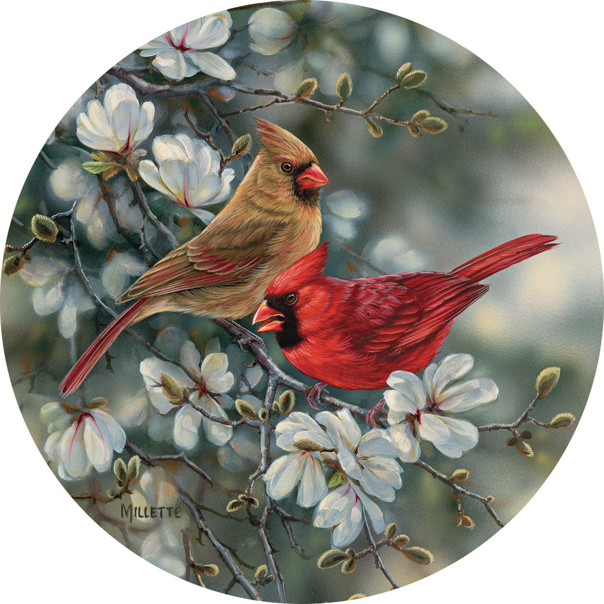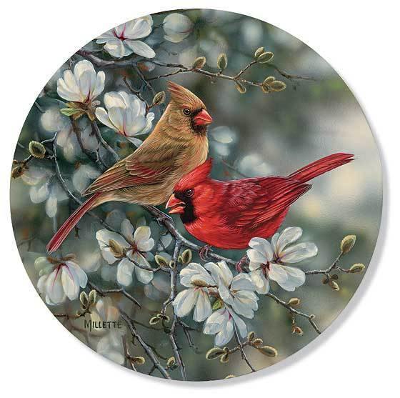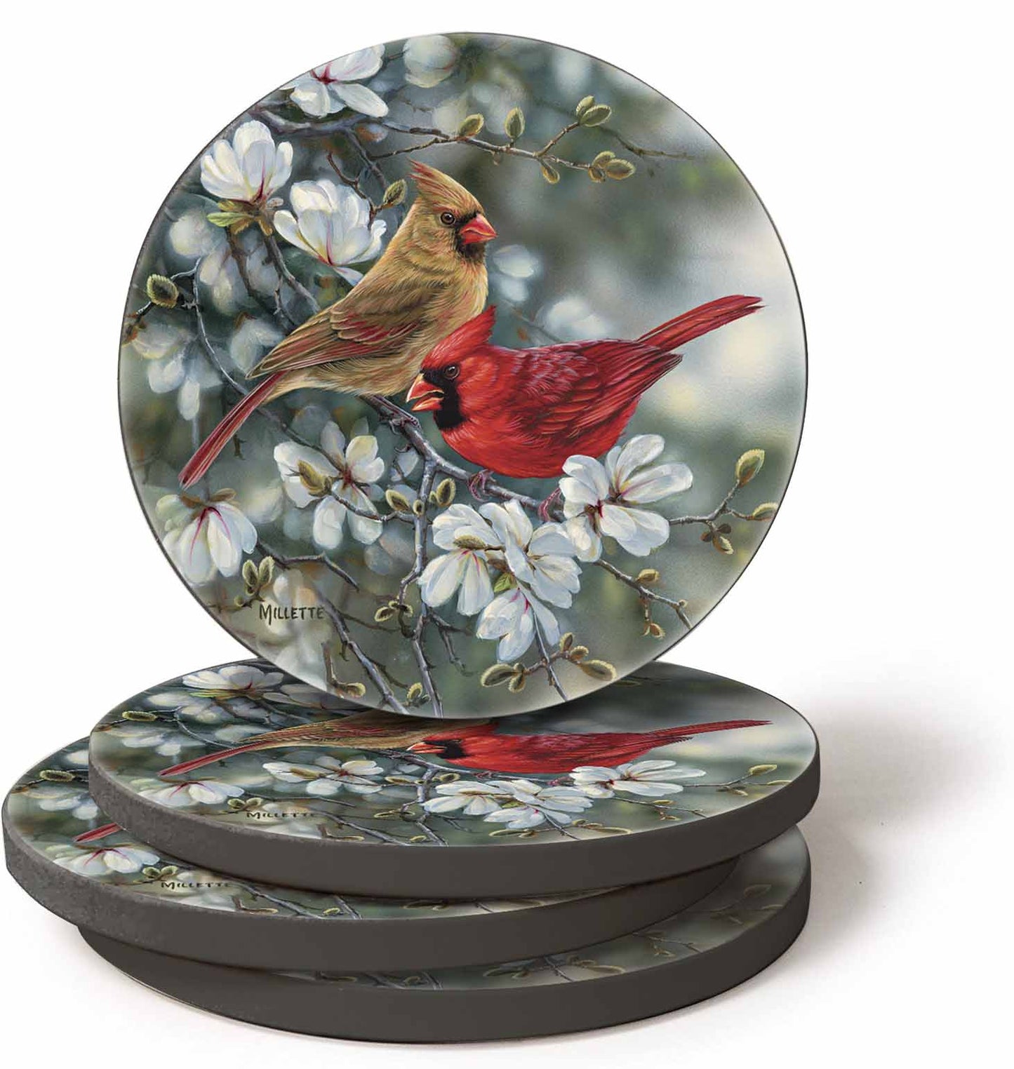 Cardinal pairs bring bright color wherever they perch; made nearly perfect amid these lovely spring blossoms. Dolomite coasters are heat and water resistant with a protective cork backing. 4"dia. A Wild Wings exclusive.