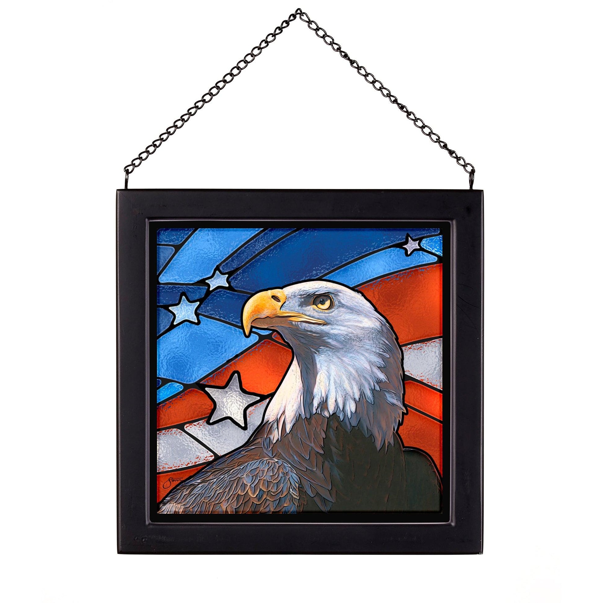 Let the light shine! New stained glass art hangings show their true colors when back-lit with natural sunlight. Popular designs are printed on glass with fade resistant inks and framed with 3/4" black-finished moulding. Framed size 9" x 9". Ready to hang with provided chain. Designed, printed, and assembled in USA.