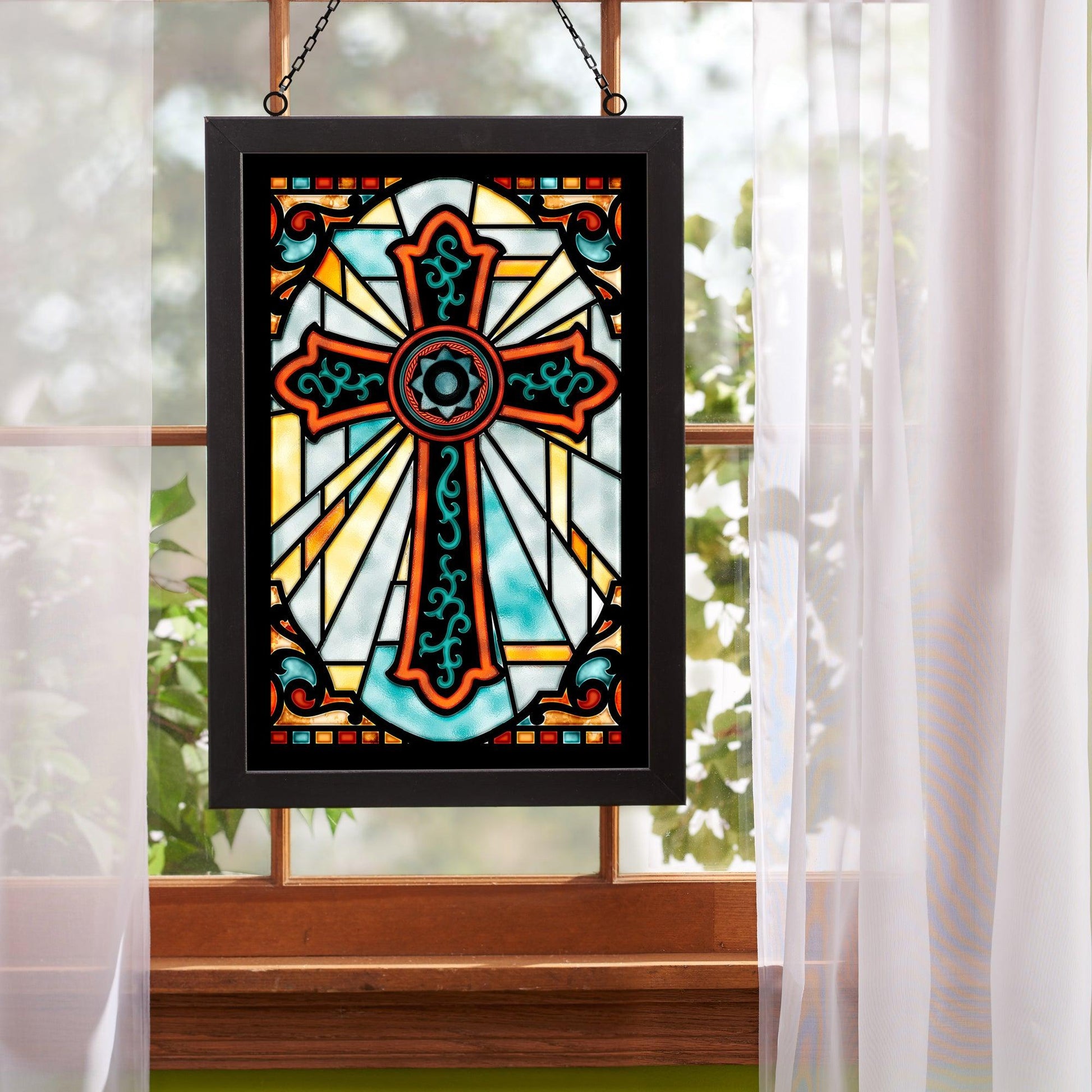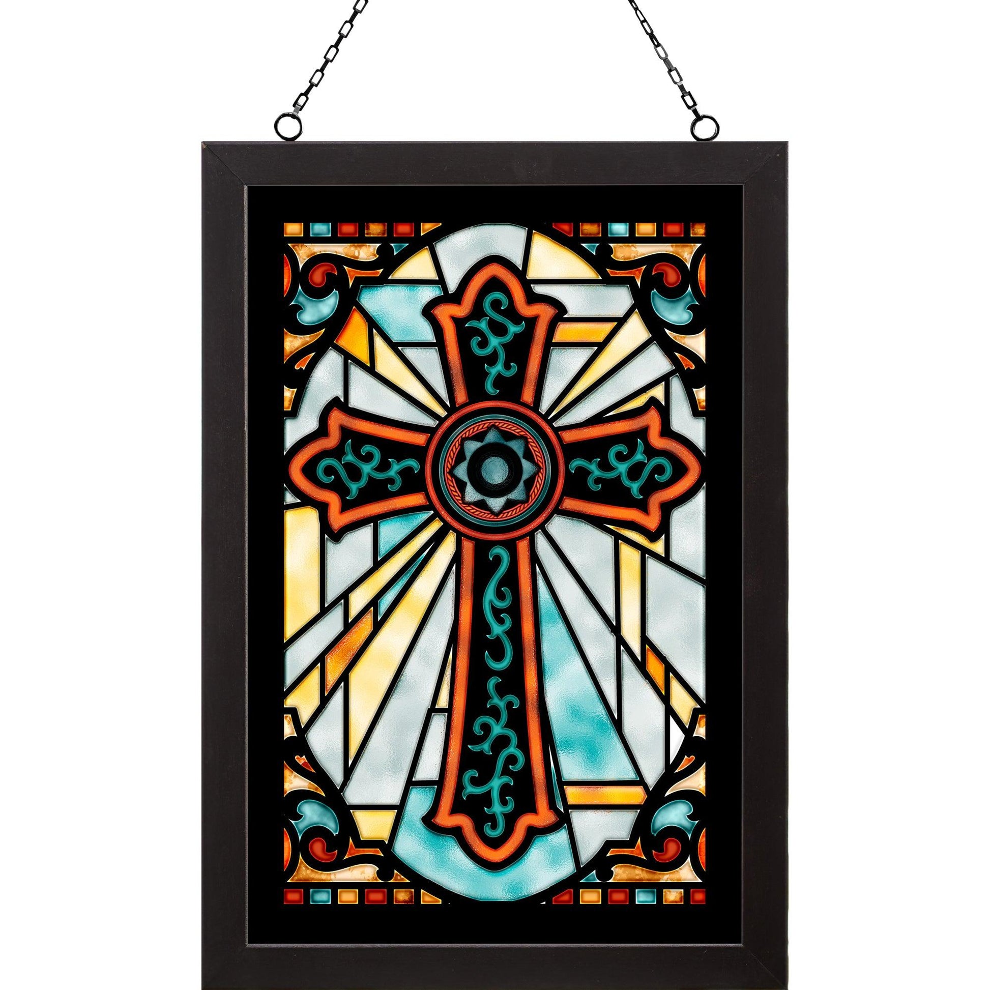 Let the light shine! Stained glass art hangings show their true colors when back-lit with natural sunlight. Popular designs are printed with fade resistant inks on 12" x 18" glass, framed with 1" black-finished moulding. Framed size 14" x 20". Ready to hang with provided chain. Designed, printed, and assembled in USA.