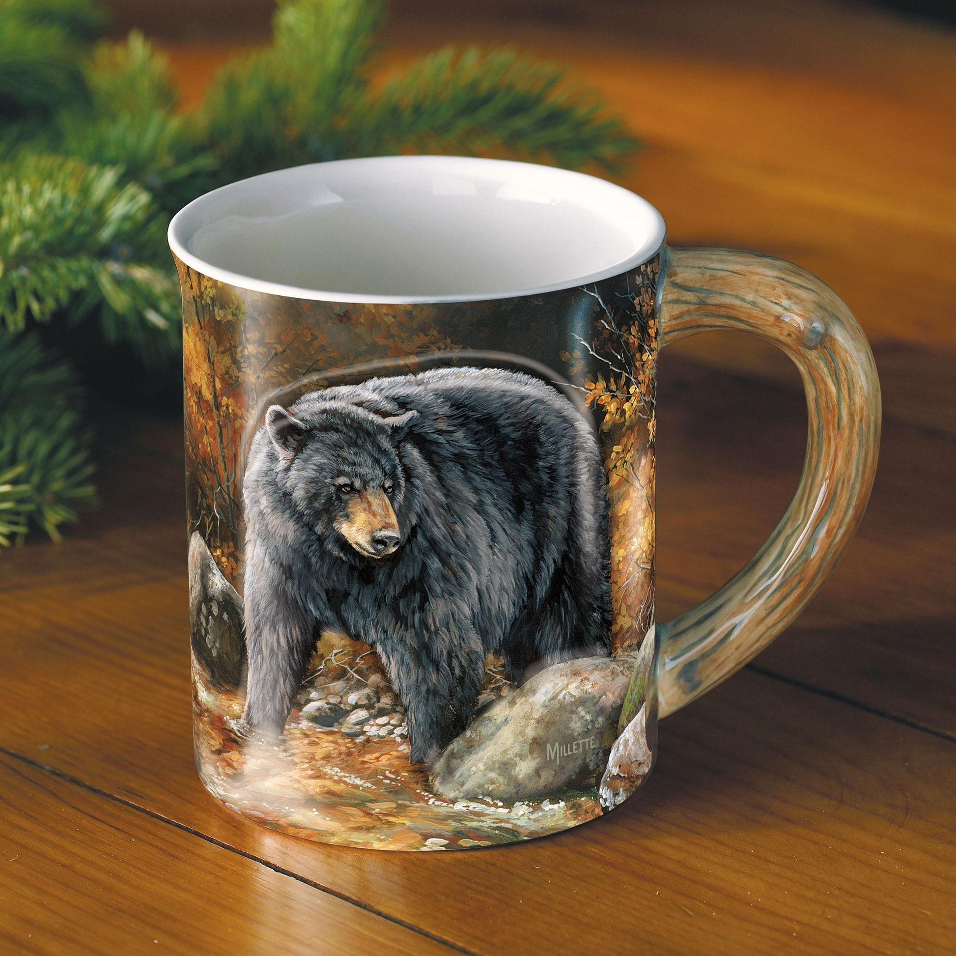 Savor a warm cup of cocoa or an Irish coffee in a mug that will rekindle some of your favorite memories. The raised, nature-themed images and sculpted handles make these stoneware mugs cherished collectibles. Microwave and dishwasher safe. Holds 16 oz. Produced exclusively by Wild Wings. Autumn Streamside-Bear. 16 oz., 4½" high