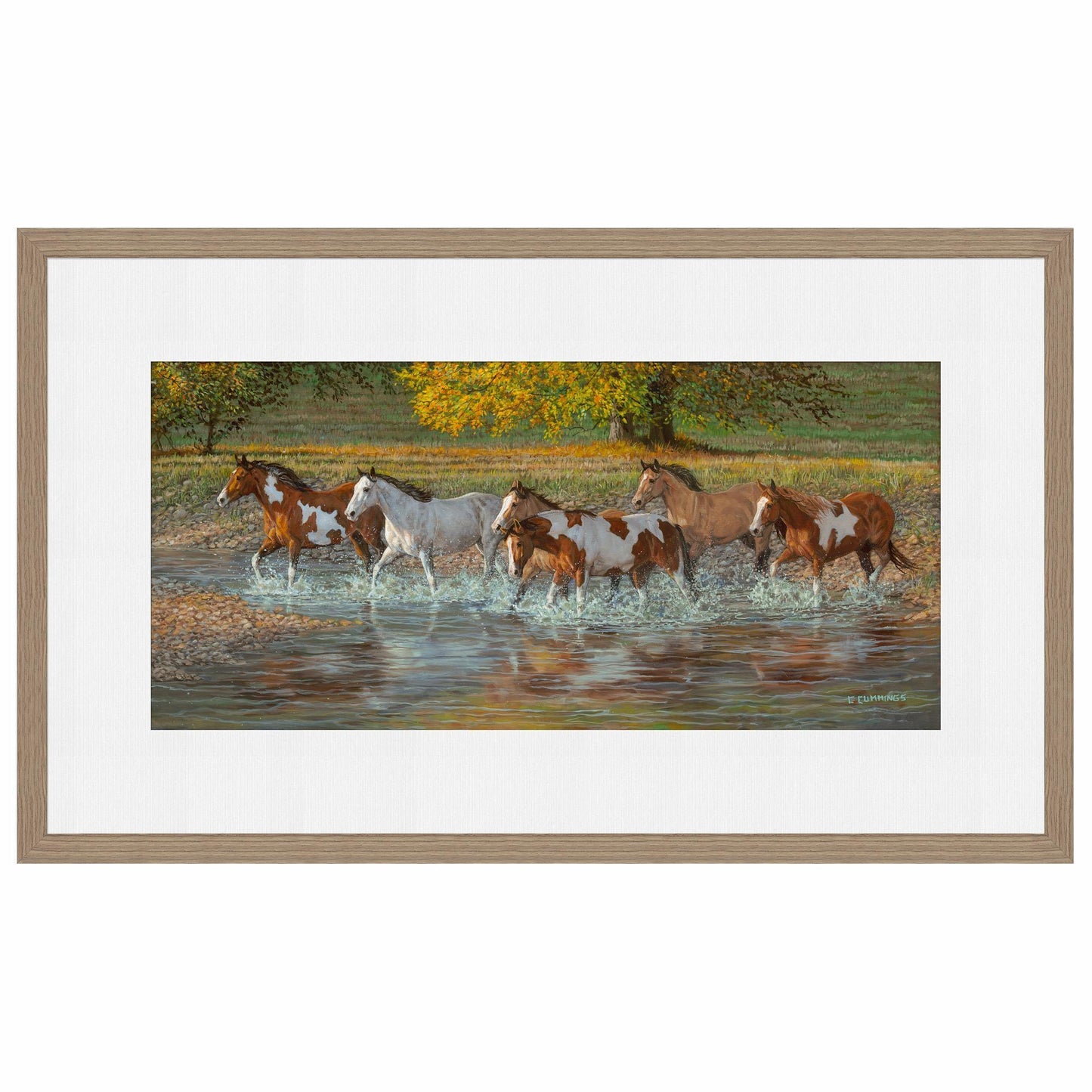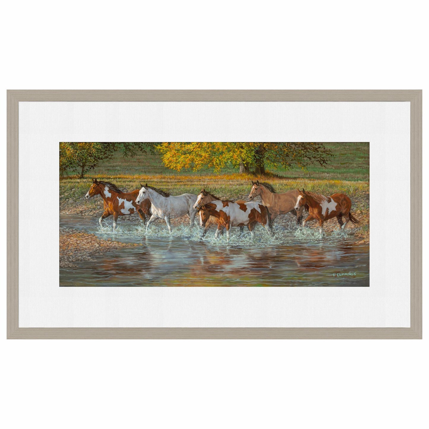 Limited edition of 450 signed and numbered prints. Image size, 13" x 30". Framed size, 26" x 42" with 1" charcoal finished wood moulding and single white outer mat. Published exclusively by Wild Wings. Made in the North America.