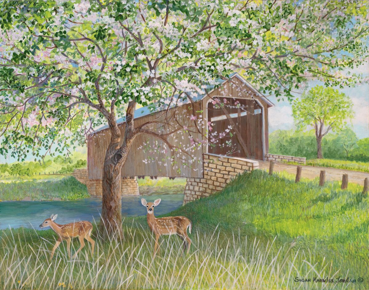 Twin whitetail deer fawns next to a blooming tree and a covered bridge.