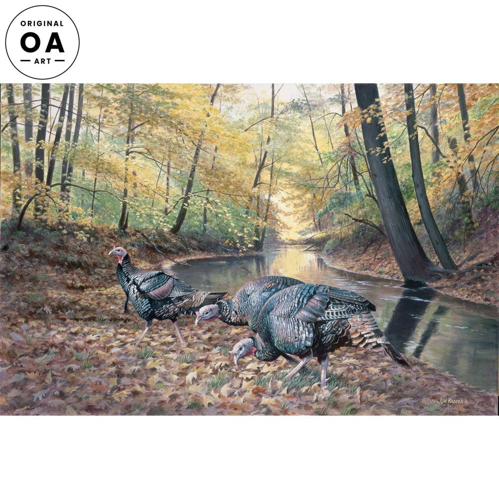 "A fall woods setting with a quiet stream flowing through it needed only one additional element, wildlife. I chose wild turkeys. The three gobblers are harvesting acorns from oaks above."