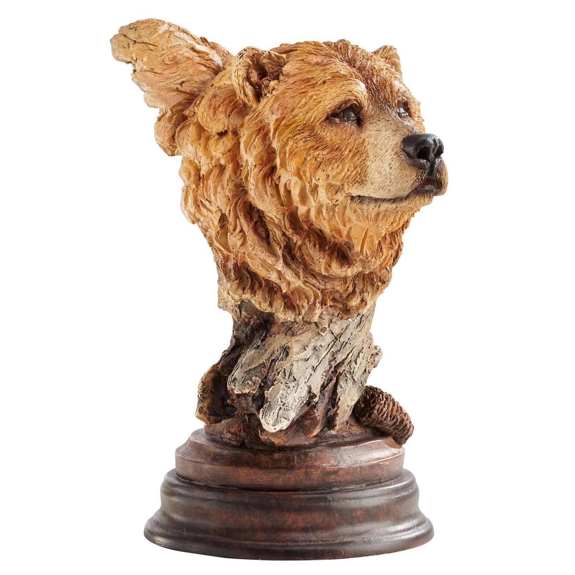 Add this sensitive portrait of a noble brown bear to your cabin or lodge for the perfect touch of Nature. Bust is positioned on an artistically arranged base of sculpted driftwood and pinecones. Cold cast and hand painted. 6-1/2"H x 4"W x 4"D.