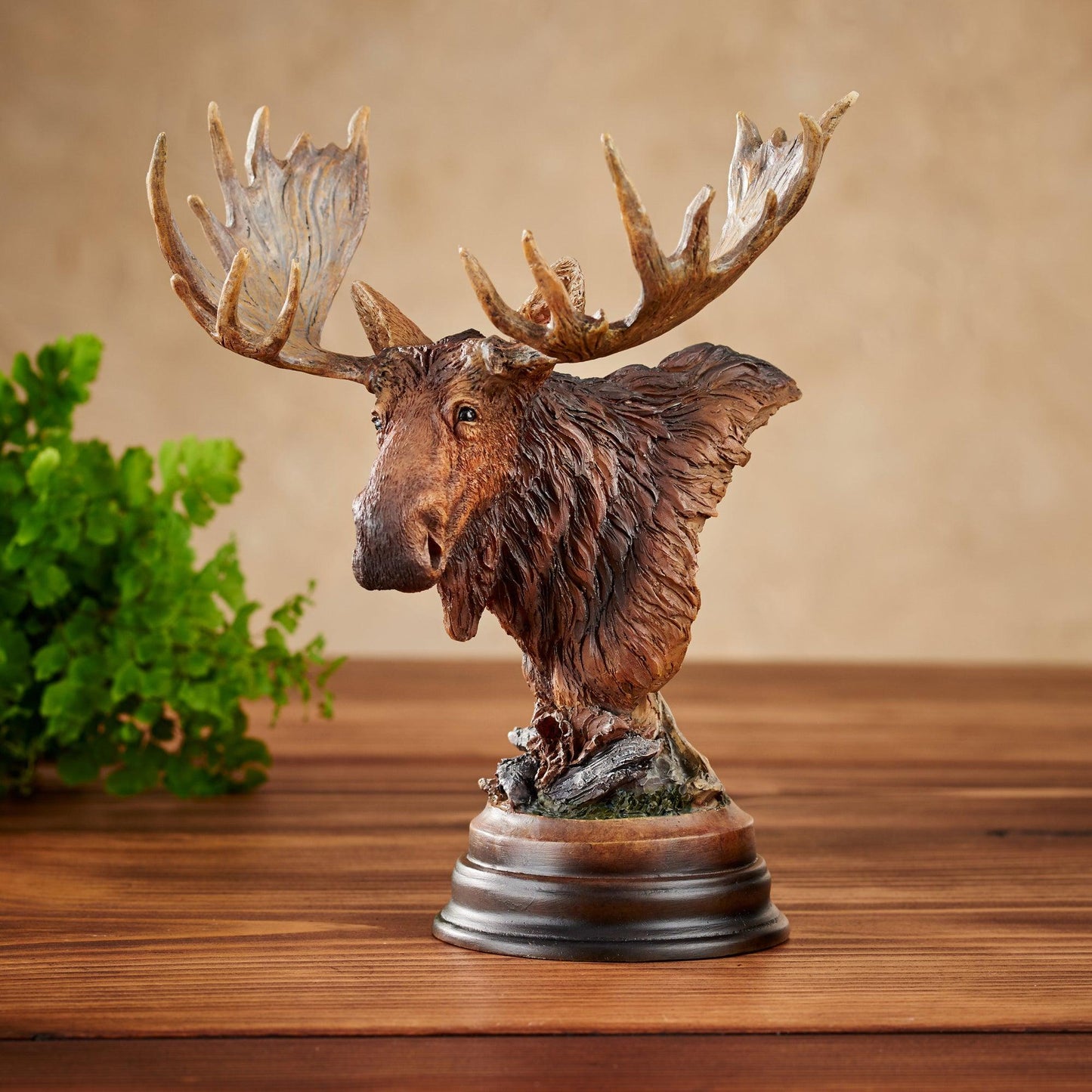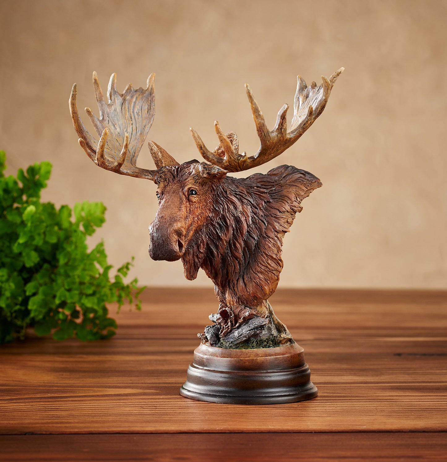 This sculpture accurately depicts the immense size a bull moose's antlers can attain each and every year. Dropping their tines after mating season to conserve energy for the winter, the bull moose consumes thousands of calories in terrestrial vegetation each day to maintain strength. Cold cast and hand painted in fine detail. 7-1/2"H x 6-1/2"W x 5"D.
