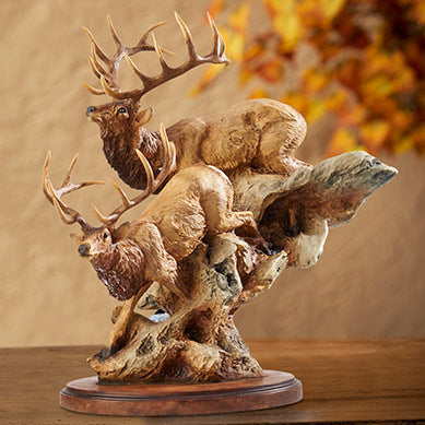 Racked and ready to go! Oh, to see and hear these two majestic elk out in the back country. In the meanwhile, they make a great sculpture for your shelf. Open edition. Cold cast and meticulously hand-painted. 9"L X 5-1/2"W X 9"H.