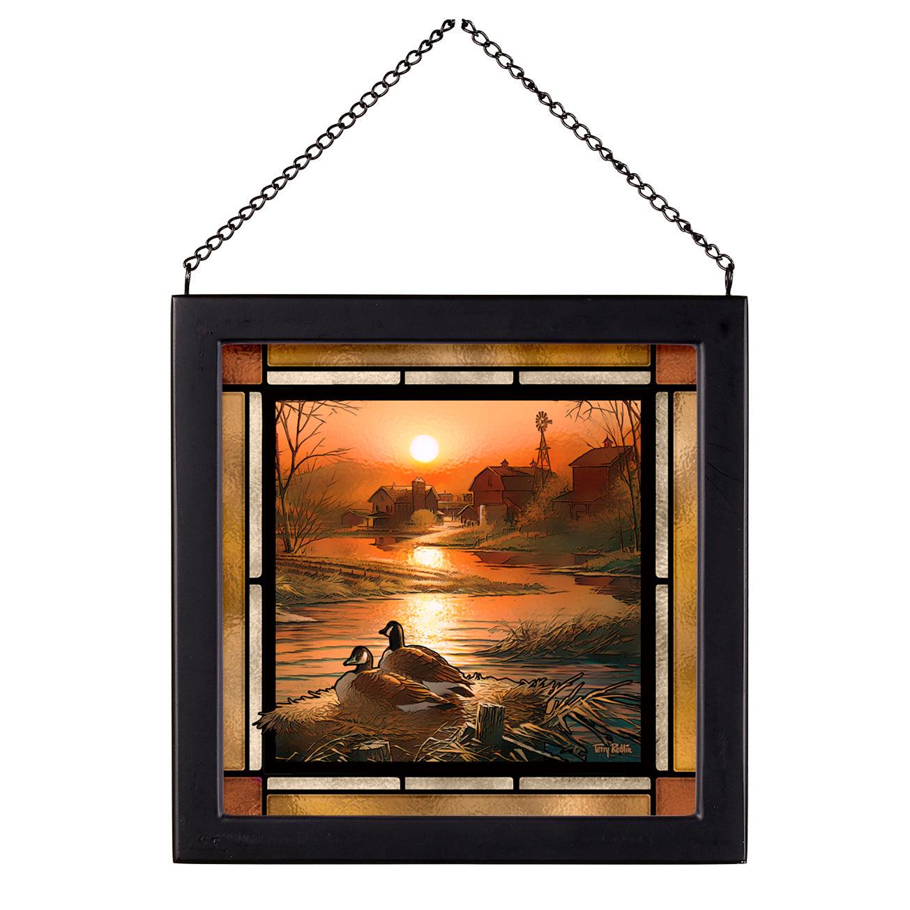 Let the light shine! New stained glass art hangings show their true colors when back-lit with natural sunlight. Popular designs are printed on glass with fade resistant inks and framed with 3/4" black-finished moulding. Framed size 9" x 9". Ready to hang with provided chain. Designed, printed, and assembled in USA.