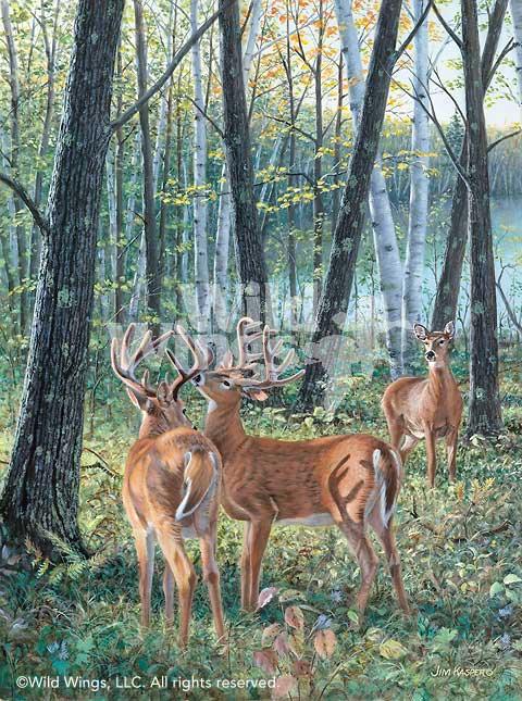 The woodland landscape and whitetail deer both go through a dramatic change between late summer and early winter. This triptych shows not only the changes in appearance but also the interaction between the deer.