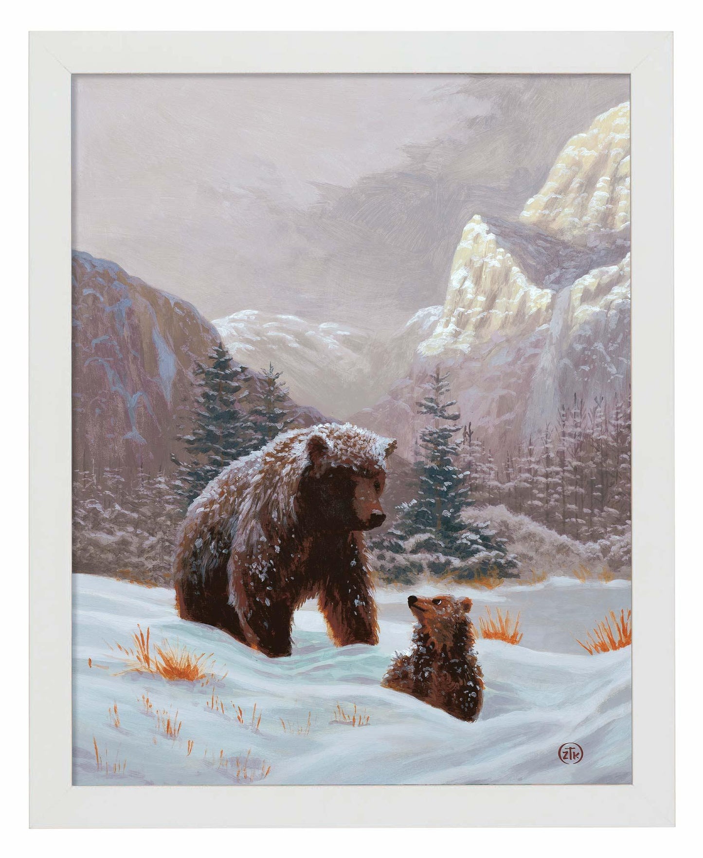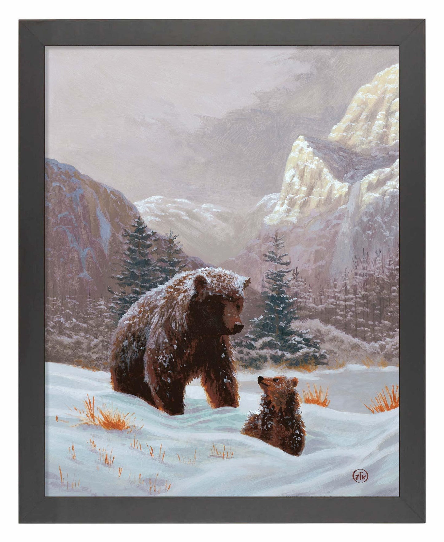"There are few words that bring more excitement to a child's heart than a parent's morning announcement of a snow day. School has been canceled and there is nothing to do but sled down hills, build snowmen and pummel your siblings in a snowball fight. For children, it is a day of unbridled joy. For parent's, however, it can be trying. Work still needs to be attended while kids slog in and out of the house changing closes, wanting hot chocolate and generally creating confusion. In my work, "Snow Day" we find that this tradition of family dynamic spreads even to the animal kingdom. A bear cub looks back at his mother wondering if he can find a playmate to enjoy the frosty day. The mother looks down with a loving patience, knowing that there still is forging to be done before the two might enjoy a winter's hibernation. As all families do, a compromise will be met between play and the practical so both mother and child will realize the fruits of their snow day together. I hope you find some nostalgia in this snap shoot in the life of a family and, as always, I want to thank you for sharing my adventure in light."—Zac Kinkade