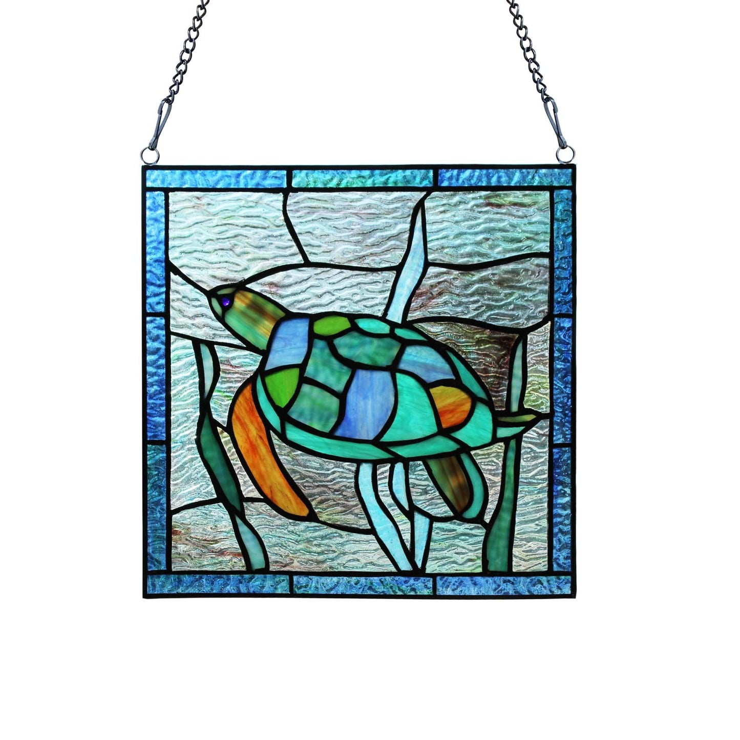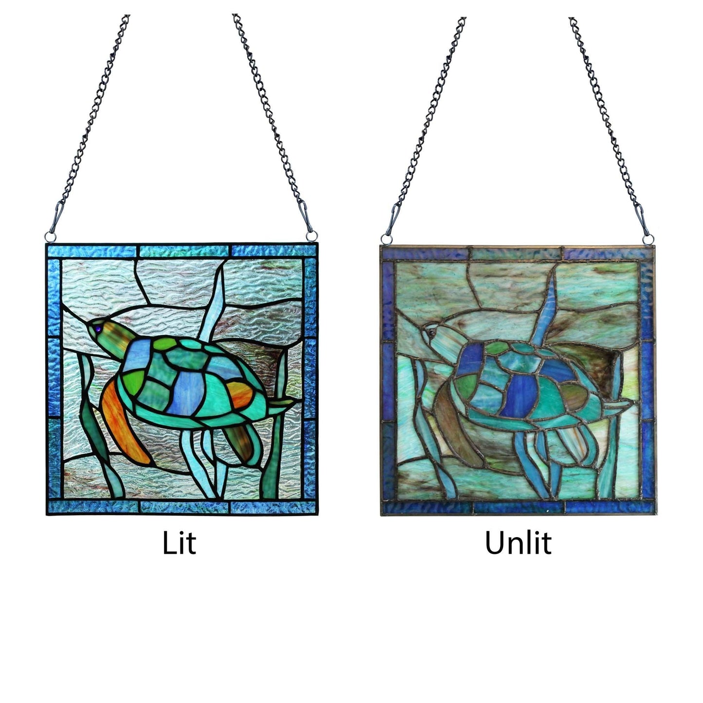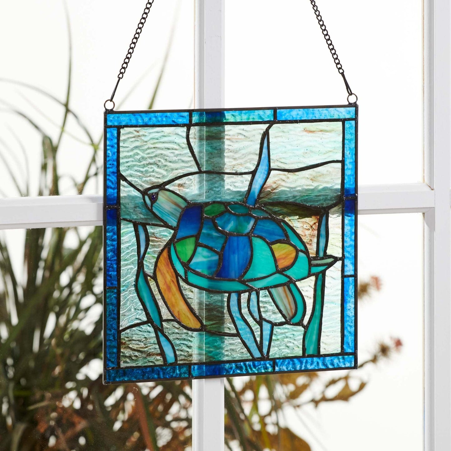 Imagine catching a glimpse of a sea turtle under the water, the rippling patterns reflecting on its back as it makes its way through tall seaweed. What you’re imagining comes to life in a beautiful stained glass sea turtle wall or window hanging. Stained glass is handcrafted with 24 pieces of high-end ripple glass, coming in shades of blue, green, and brown. Hang this on a window to watch the panels come to life. Clean with a damp cloth. 10½"H x 10"W x 2½"D.