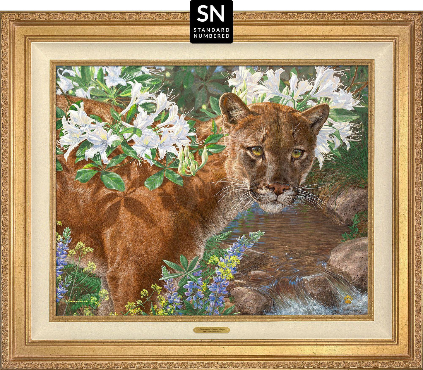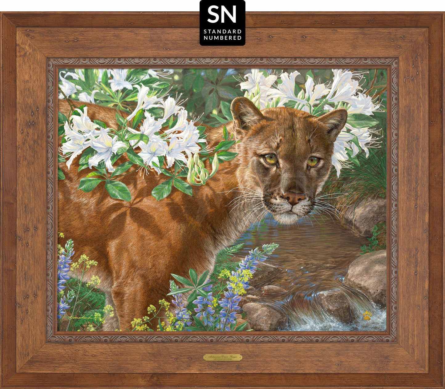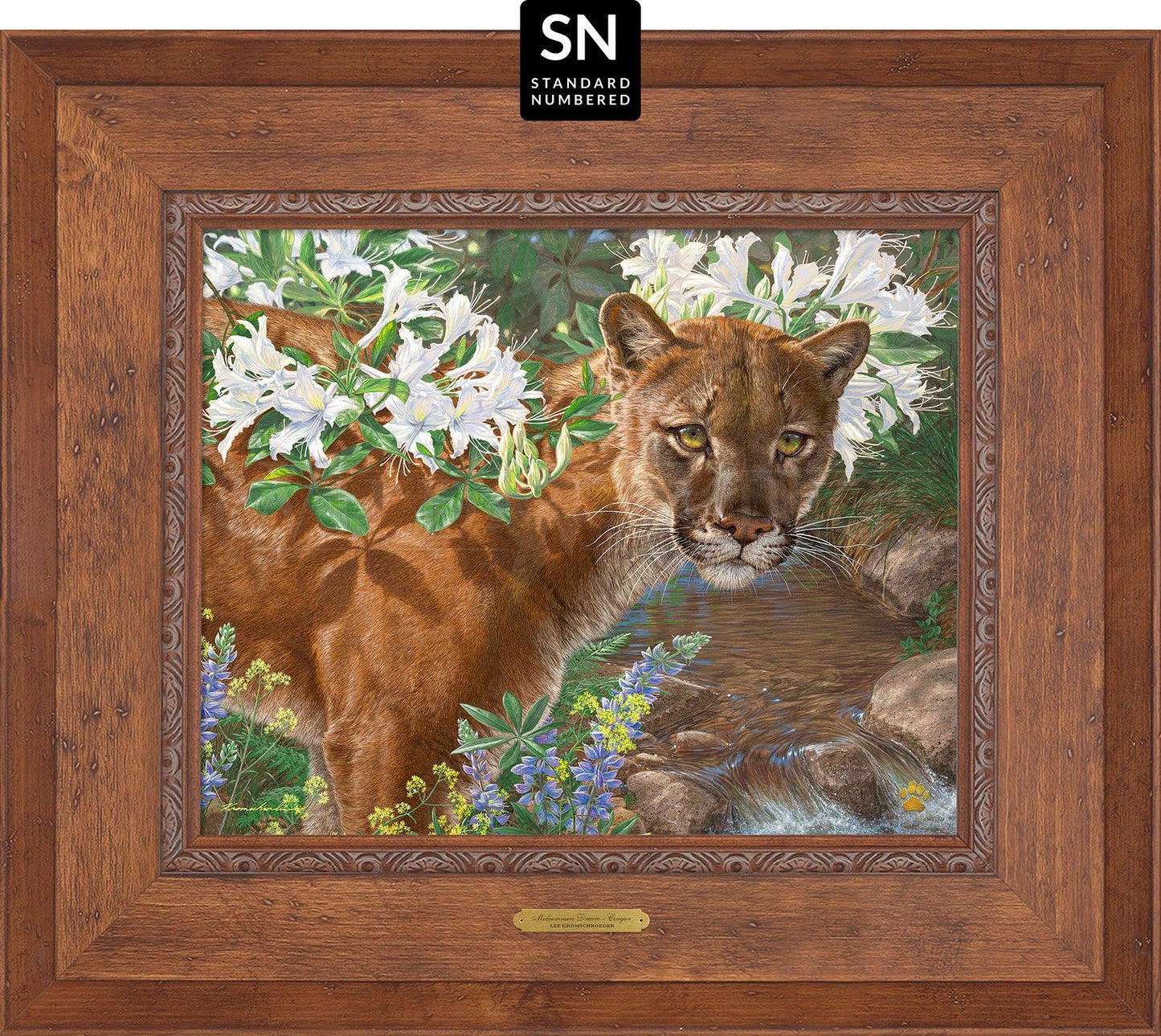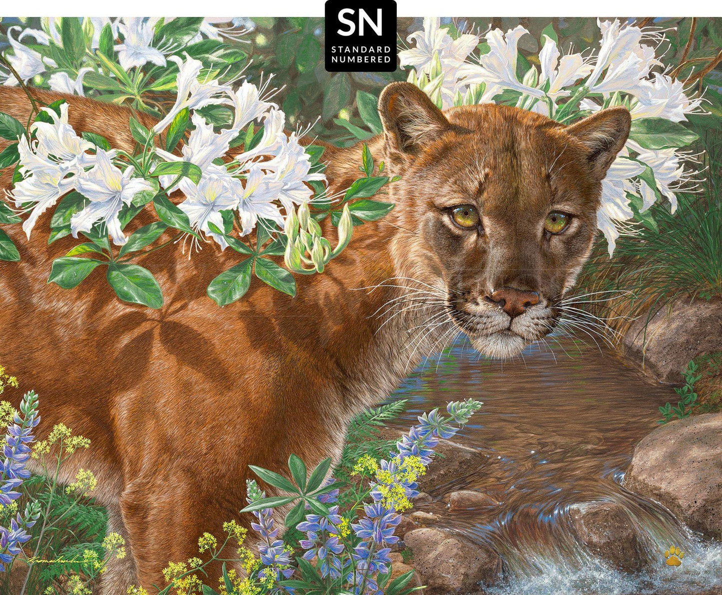 “After a night’s hunt, a young cougar makes her way through the mountain terrain past the rhododendron and lupines to a welcoming cool watering hole.”