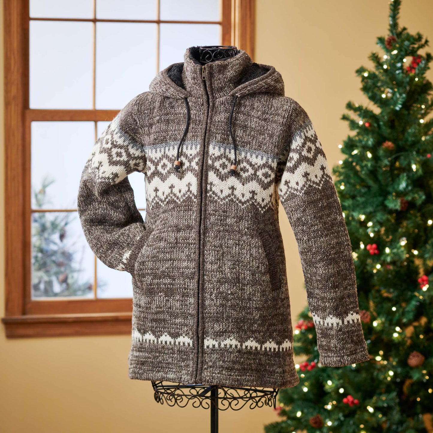 While the Southwest boasts hot and dry weather, it also includes some snowy escapes. Whether you’re hitting the slopes or escaping to a wintry getaway, a Southwestern-style long jacket, in snowy whites, neutrals, and grays, is a perfect comfortable companion. Wool jacket with fleece lining can be dry cleaned and laid flat to dry. Specify size. Imported.